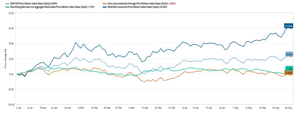 At the end of May, more tech-oriented equity market indices showed strong investment returns.  The S&P Index, with 35% of its weight comprised of the top ten megacap tech companies [2], was up nearly 9%.  The tech-oriented Nasdaq Composite was up 22%.  The Dow Jones Industrial Index, made up of slower-growth, mature companies, was down nearly 1%.  The Bloomberg Barclays U.S. Aggregate Bond Index eked out a 1% gain.